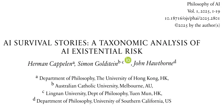 超级智能可能在未来几千年内彻底终结人类文明。香港大学、澳大利亚天主教大学等大学的哲学家研究团队的一篇深度研究,通过构建一个严密的分类学框架,将人类在人工智能威胁下的生存路径拆解为四种核心模式,即技术停滞、文化禁令、目标对齐与外部监管。
