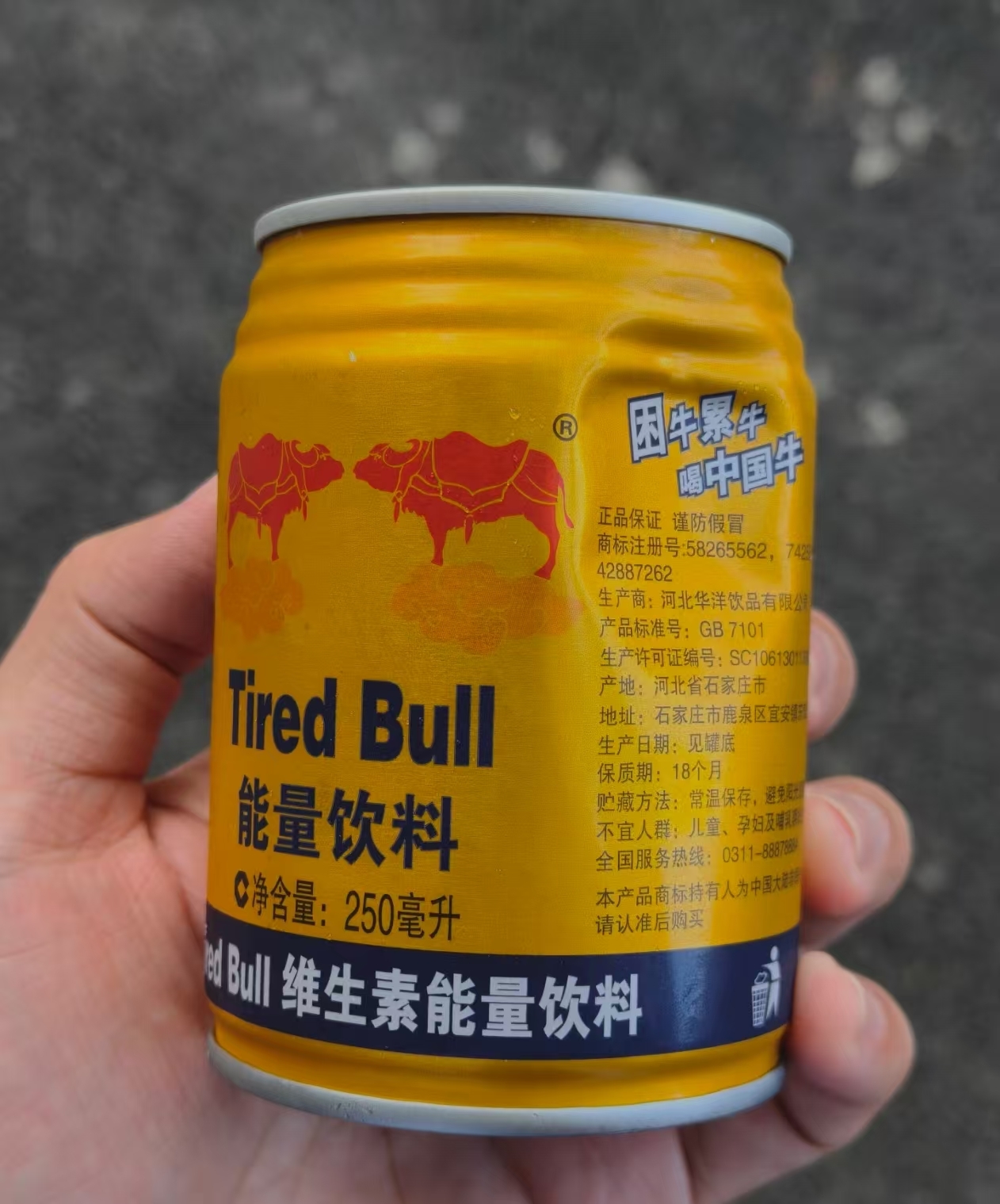 近日有网友在社交平台上表示,本来想买红牛饮料,可到手后却发现误买了“困牛、累牛”饮料。据悉,网友网购的饮料为黄色罐装,罐身印有红色牛元素图案及“tired bull”字样,包装与红牛高度相似,6罐花费共12元。