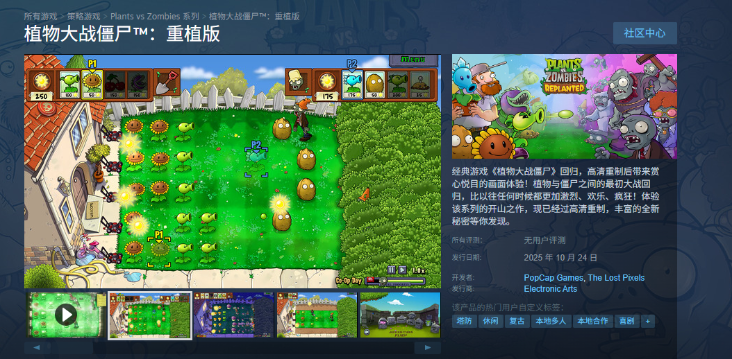 今日,经典塔防游戏《植物大战僵尸》高清重制版——《植物大战僵尸:重植版》在Steam平台开启预载,将于10月24日发售。《植物大战僵尸:重植版》Steam国区售价98元,预购玩家可获得一款复古豌豆射手皮肤,游戏支持简体中文界面、字幕。