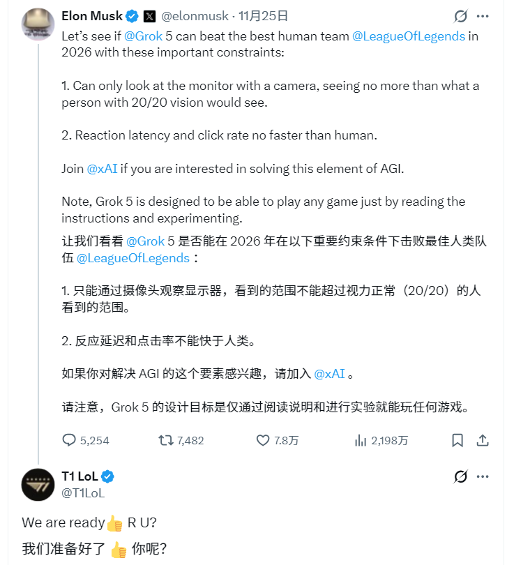 除此之外,《英雄联盟》开发商Riot Games联合创始人兼总裁Marc Merrill也回复了马斯克,表示将就“AI与人类顶尖高手的对战”进一步进行详细讨论。