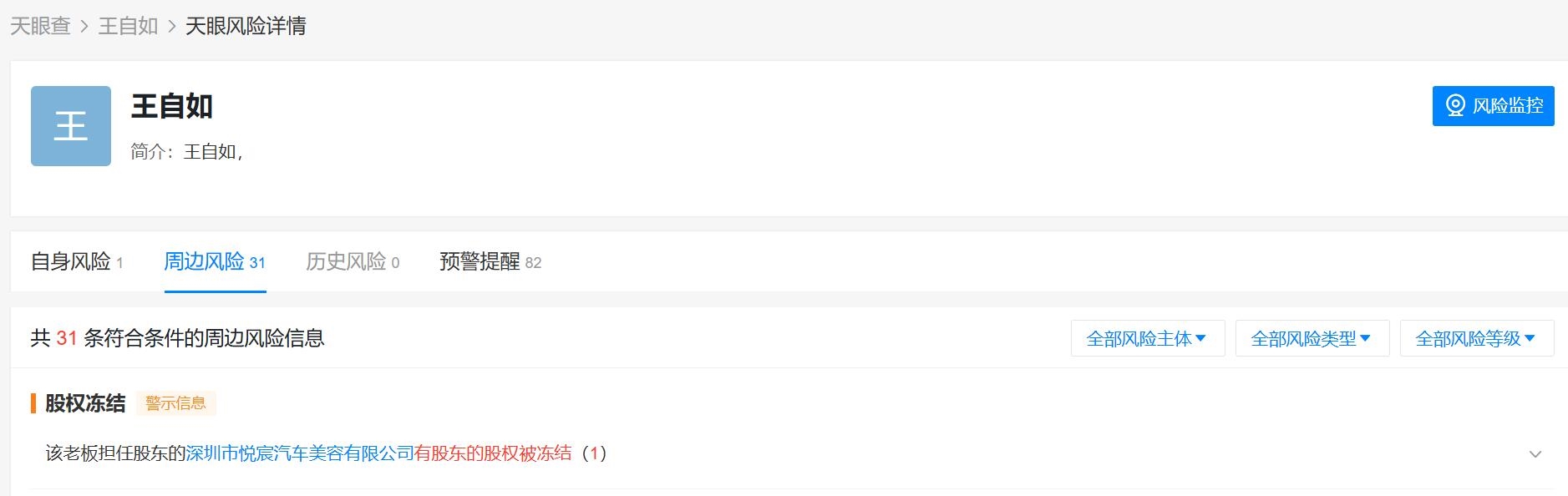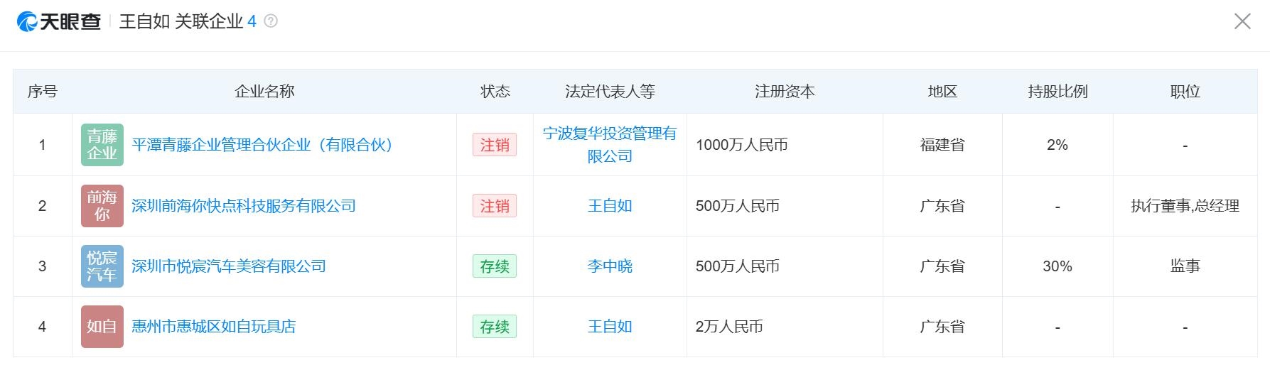 天眼查显示,王自如名下关联多家企业,其中深圳市悦宸汽车美容有限公司处于存续状态,今年1月,该公司因未依照规定的期限公示年度报告,被深圳市市场监督管理局南山监管局列入经营异常名录,有2家企业已注销,分别是深圳前海你快点科技服务有限公司、平潭青藤企业管理合伙企业(有限合伙)。
