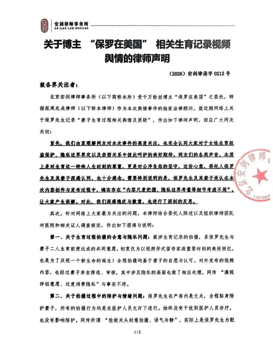 2月12日深夜,周兆成律师就博主“保罗在美国”生育记录视频引发的舆情,发布专项律师声明,针对公众关注的各类问题集中作出回应,保罗先生及其妻子也同步承认内容尺度考虑不周,并向公众致歉。