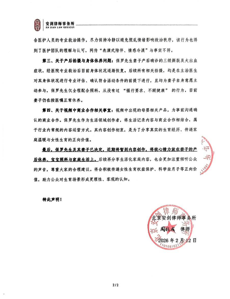 声明指出,涉案生育记录的拍摄,系保罗先生与妻子在生育前便共同达成的意愿,初衷仅为以视频形式留存家庭重要时刻的美好回忆、庆祝新生命的诞生,全程拍摄均建立在妻子自愿与认可的基础上。