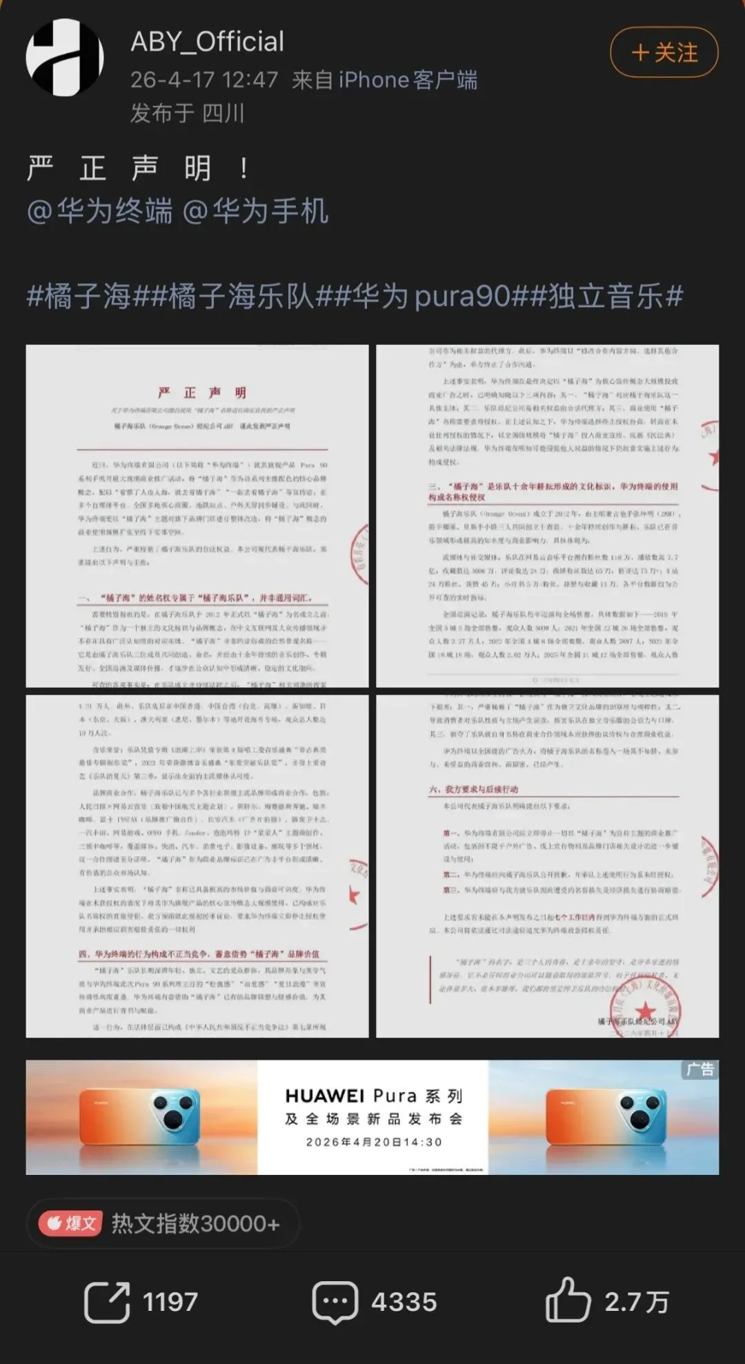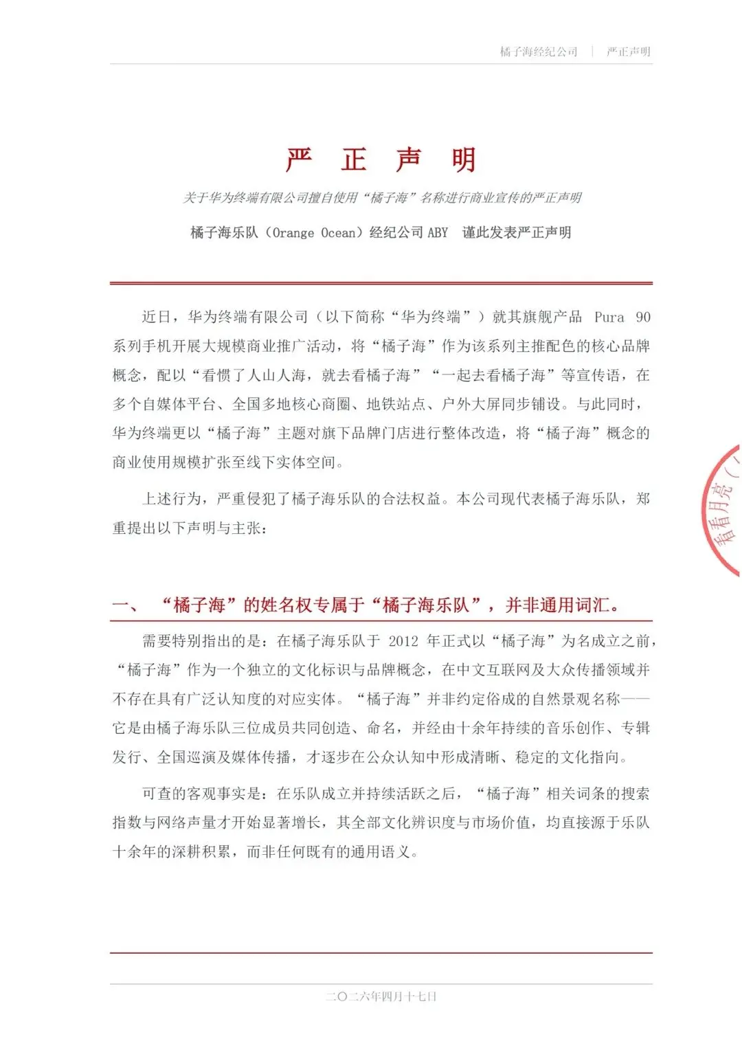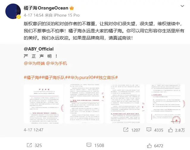 其次,指出了关键细节,此前双方曾洽谈过合作,后来华为终端单方终止合作,未经乐队任何授权,擅自将“橘子海”作为Pura 90系列手机的配色名称及核心宣传概念,在全国范围内进行大规模商业推广,该行为已构成名称权侵权与不正当竞争,侵害了乐队的品牌权益与商业利益。