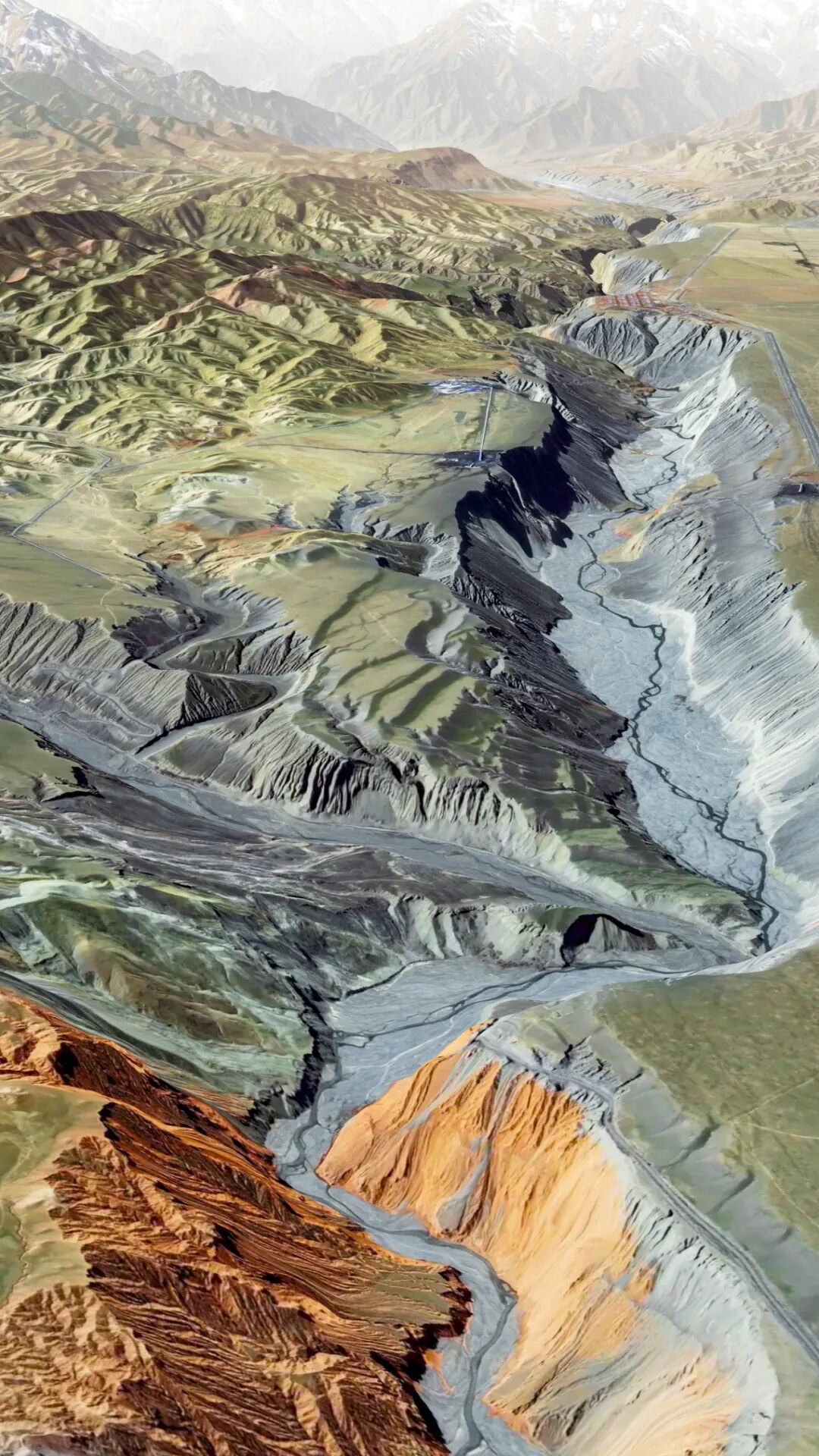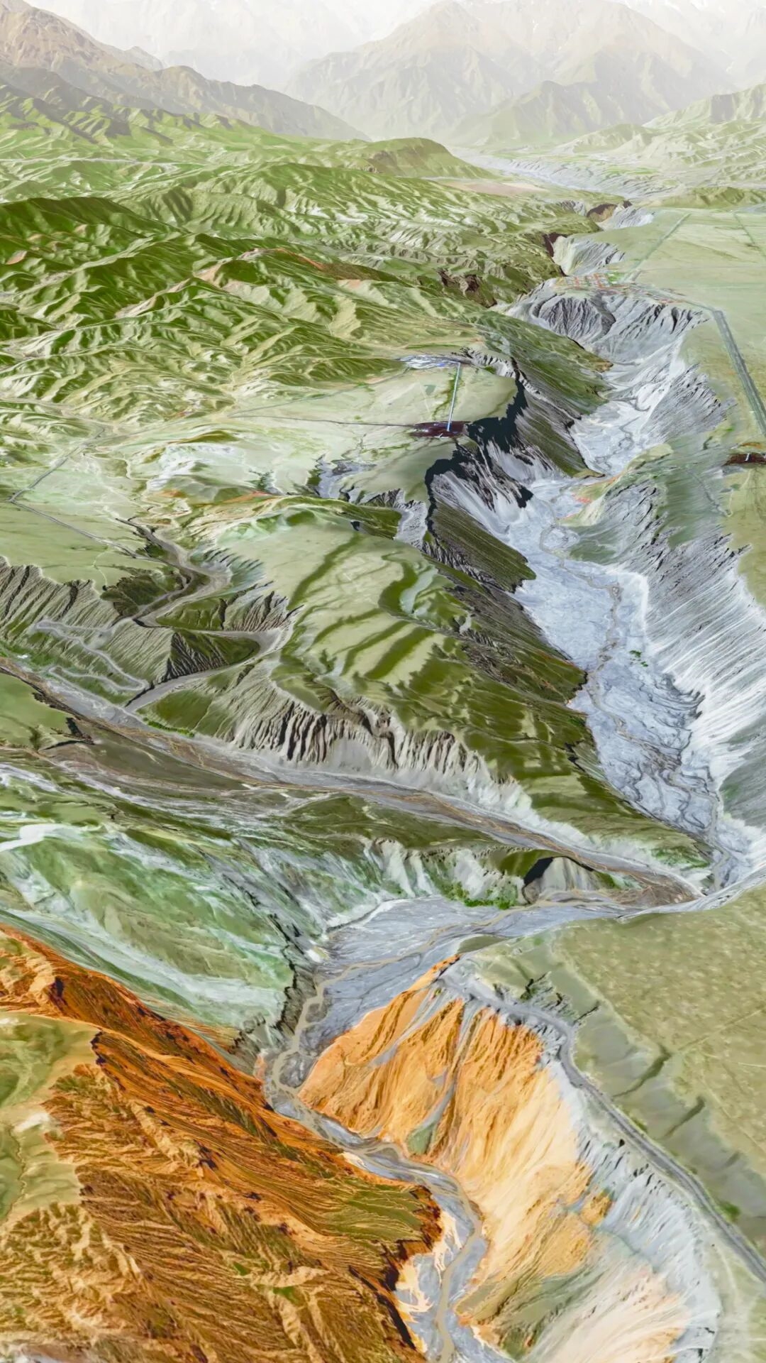 在3D卫星地形图上,安集海大峡谷的宏观格局更为直观,完美展现了河谷中蜿蜒流淌的河流,千转百回的姿态如同活脱脱将大地切割开来的鬼斧神工。