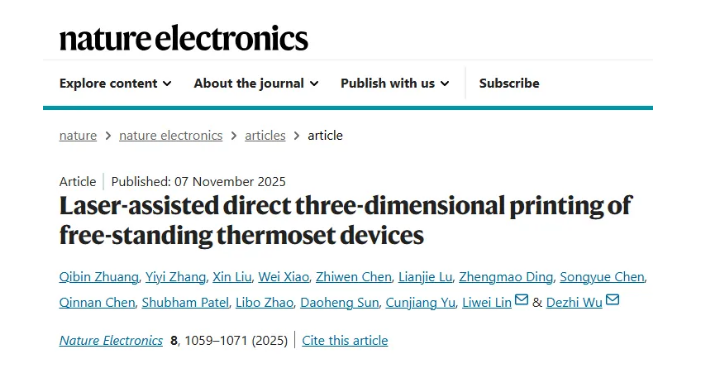 据媒体报道,厦门大学萨本栋微米纳米科学技术研究院吴德志教授团队在3D打印技术领域实现重要突破——创新提出“激光原位诱导直写打印”技术,将热固性材料三维柔性器件的固化时间从传统工艺所需的数十小时大幅缩短至0.25秒,有效解决了该领域长期存在的成型速度慢、工艺复杂、性能难以精确调控等核心难题。