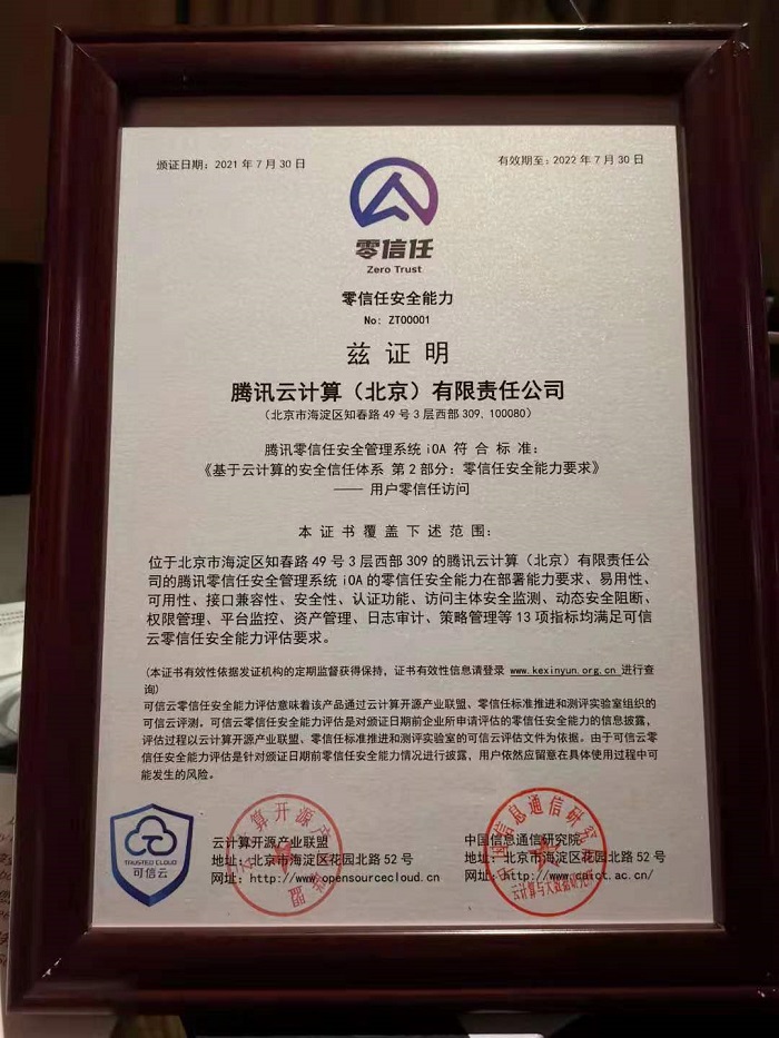 (腾讯iOA获得中国首个零信任产品测评认证)