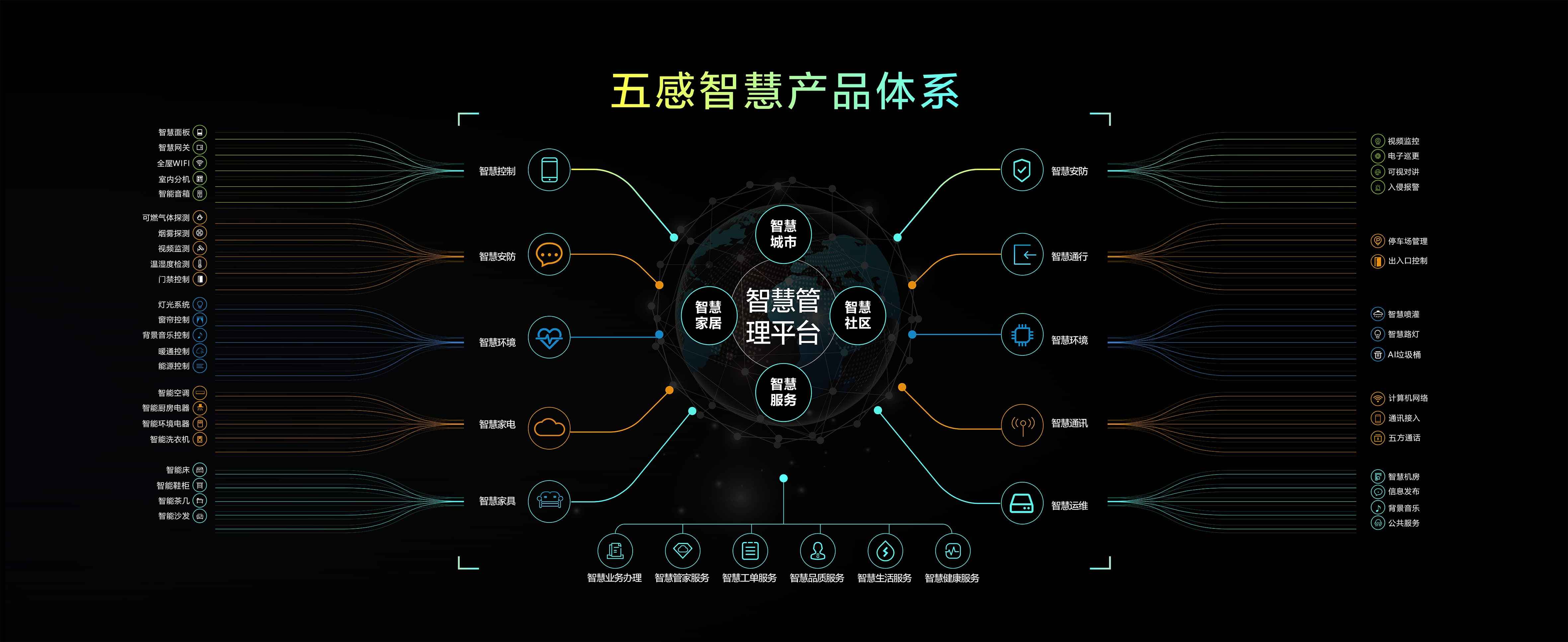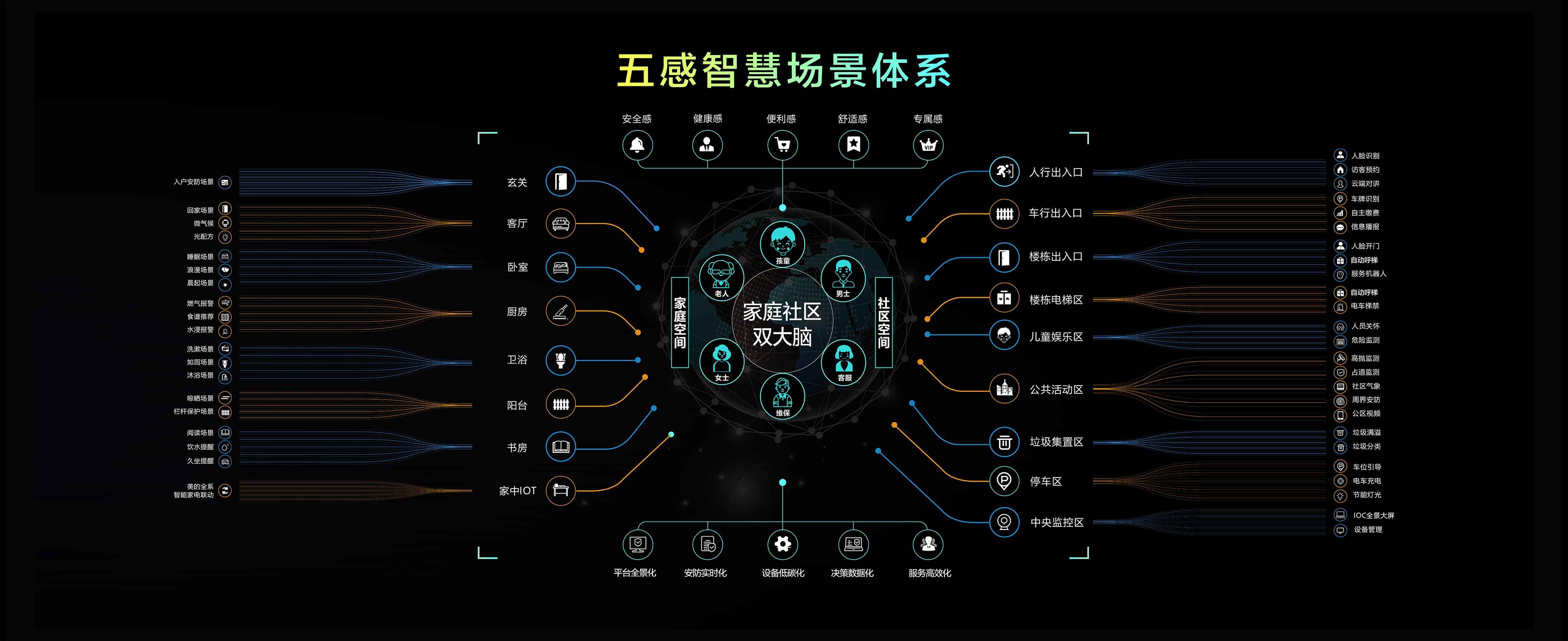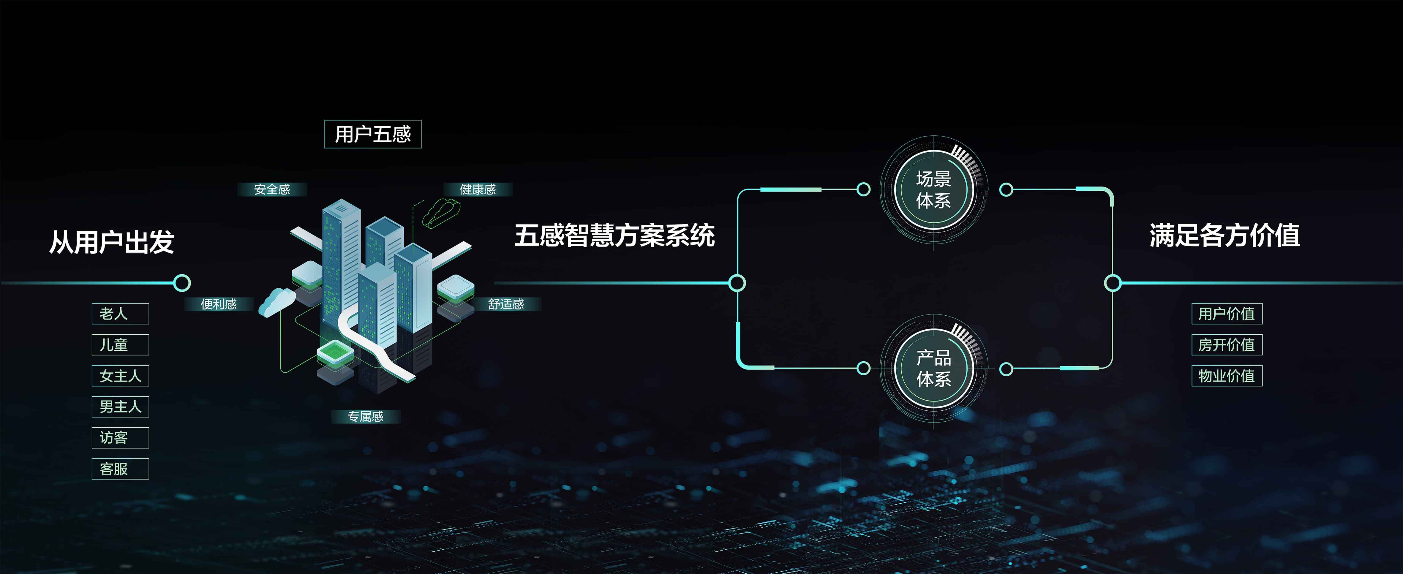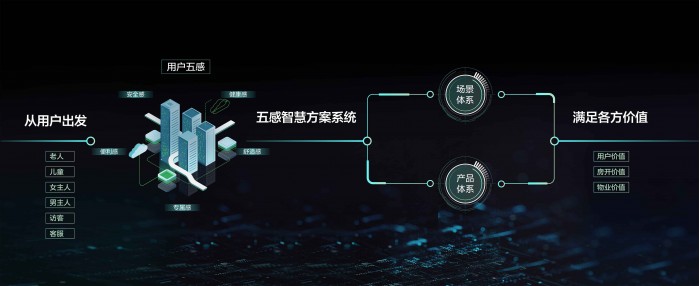 用户是智慧生活的核心,睿住智能“五感智慧方案系统“从用户的安全感、健康感、便利感、舒适感、专属感出发,基于用户需求,整合生态资源,研发智能化场景。“五感智慧方案系统”涵盖了“场景体系”和“产品体系”。场景体系是围绕不同人群在家庭空间和社区空间中的各种生活场景,结合物联网和智能设备,由智慧大脑驱动,为不同用户提供相应场景服务。产品体系则是从软硬件、设备的应用功能层面,为安防、通行、环境、通讯、运维、家电家具等提供系统性支撑。