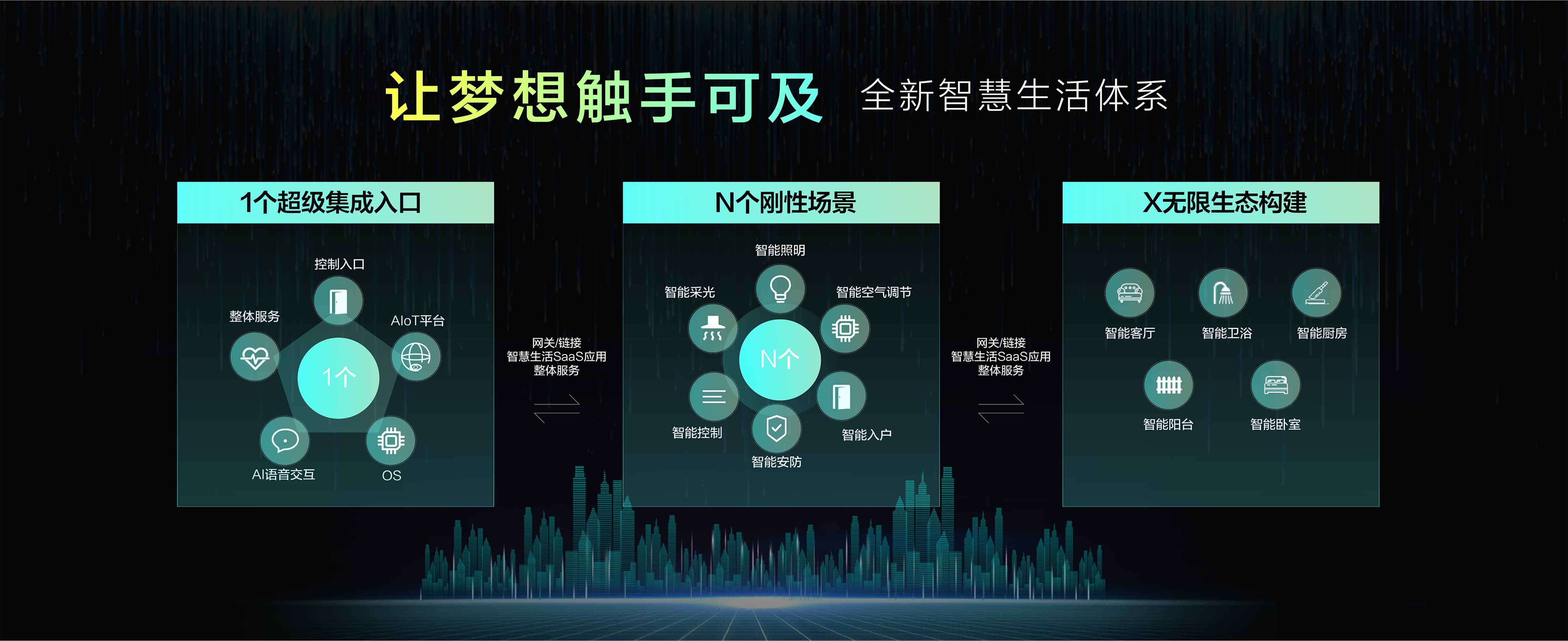 智慧生活1+N+X体系,是睿住智能基于“五感智慧方案系统”所打造的全新家庭-社区一体化解决方案。 “1”,指的是1个超级入口,集成所有场景控制。“N”,是说通过一体化AIoT平台,链接生态产品,形成N个智能生活场景。“X”,则是基于1和N,形成全屋空间互联互通的生态,构建X生态,可无限扩展智能产品。