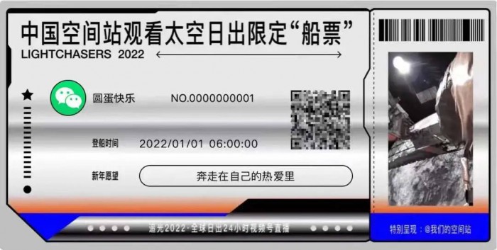 对应这份浪漫,视频号还为“追光2022”专门开发了全新的直播间互动体验:领取“中国空间站观看太空日出限定‘船票’”。每张船票都有唯一编号,成为观众们独特的“追光”记忆。