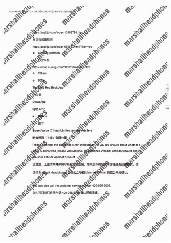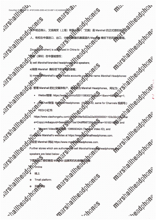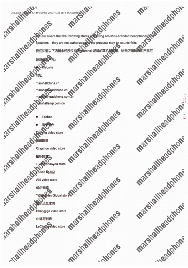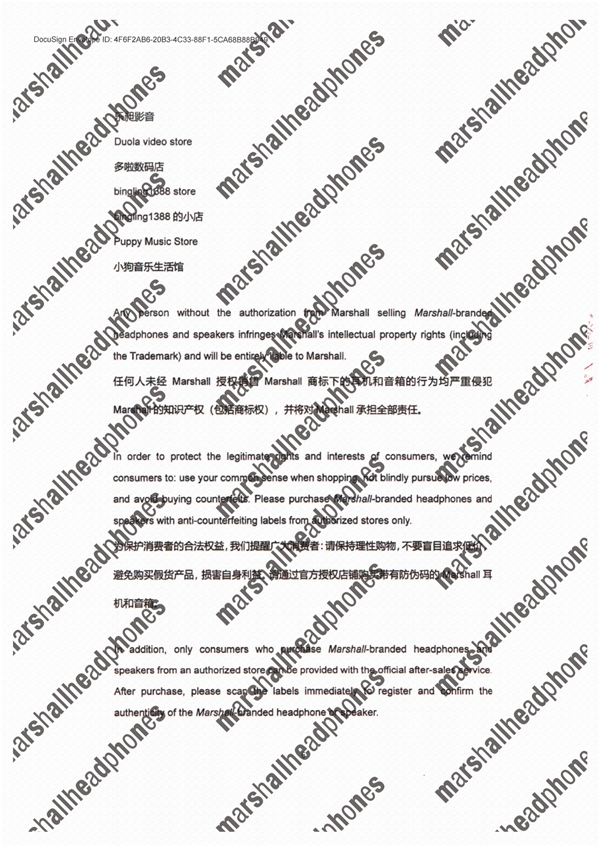 该《声明》针对Marshall各授权方的授权权限、渠道、社交媒体、微信公众号以及防伪查询方式做了具体说明,并公布了可能系销售Marshall假货的店铺、网站等,以提醒广大消费者理性购物,谨防假冒伪劣产品。