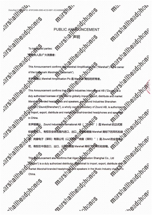 为维护广大消费者的合法权益及品牌相关方的利益,诞生于1962年的英国音频品牌Marshall Amplification PLC被授权方 “尚音电子(深圳)有限公司” ,于近日联合Marshall各授权渠道共同发布了《致广大消费者声明》。