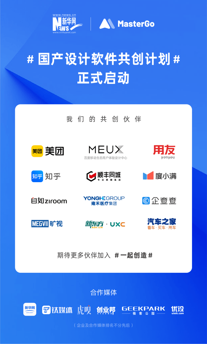 据了解,MasterGo 本次推出的“国产设计软件共创计划”将致力于解决开发者和使用者之间的断层沟通,快速实现以用户和以具有更高要求的头部企业需求为导向的产品迭代。截至发稿前,包括美团设计委员会、百度移动生态用户体验设计中心、用友网络、知乎、顺丰同城、度小满、旷视科技、新东方、汽车之家、自如、雍禾医疗、企查查等各行业头部企业都与其完成了签约。