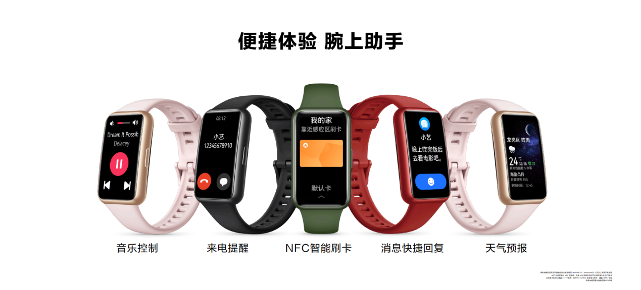 作为鸿蒙生态下的智能穿戴产品,华为手环7还支持大屏联动功能,用户可将运动数据实时同步至智慧屏,无需抬腕就能查看数据。另外,华为手环7NFC版本,支持门禁卡、交通卡等功能。不仅如此,年轻用户喜欢的微信和支付宝支付(微信支付后续OTA升级)以及音乐控制、遥控拍照、AOD息屏显示、信息提醒等功能在华为手环7也都一应俱全。