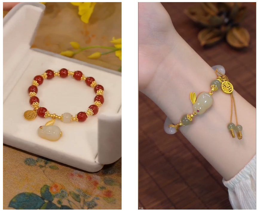 另外,除了珠宝大牌借势“玉兔”营销外,我们发现也有不少饰品商家接连上线“中秋国风玉兔福牌手链”“天然和田玉玉兔手镯”等商品,并结合 相思、红豆、Q版、礼物 等关键词进行营销,也成功捕获了24岁以下年轻女性的少女心。