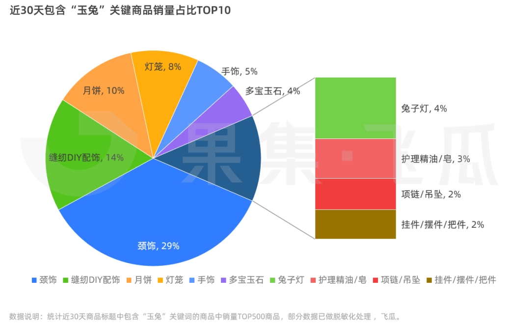 比如近期“中秋”“玉兔”等关键词的搜索热度、成交指数均有指数级提升。以“玉兔”为例,选取了近30天销量TOP500的商品,颈饰/手饰等饰品类和DIY手工灯笼/兔子灯等产品占据了绝对的市场份额。