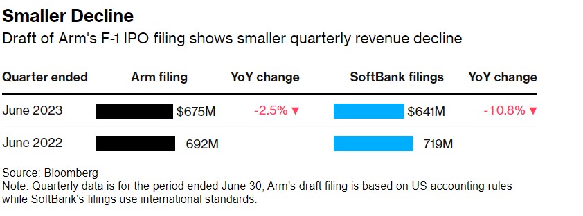 相对较小的降幅——Arm的F-1 IPO文件草案显示,季度营收降幅较小(注:季度数据为截至6月30日的数据;Arm的文件草案基于美国会计准则,而软银的文件则采用国际准则。)