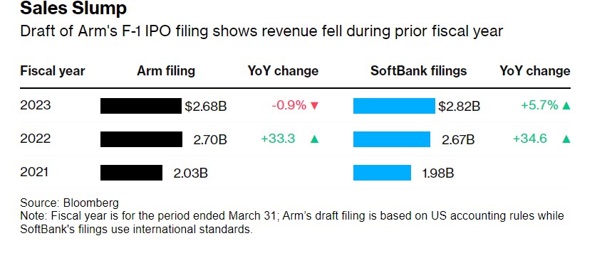 销售额低迷——Arm的F-1 IPO文件草案显示,上一财年的营收出现下滑(注:财政年度为截至3月31日的期间;Arm的文件草案基于美国会计准则,而软银的文件则采用国际准则。)