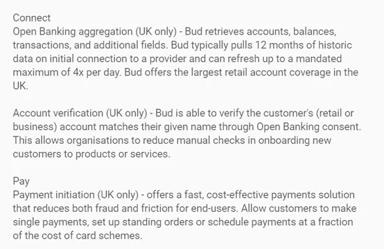 Bud提供了连接服务,特别是在英国市场,通过开放银行聚合服务,Bud能够检索账户信息、余额、交易等,并提供长达12个月的历史数据,每天可以多次刷新。账户验证服务则确保了客户账户信息的准确性,减少了大量人工检查流程。