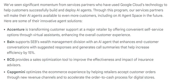 Google Cloud通过各种市场资源,例如,广告和活动,提高合作伙伴AI Agent的知名度,并通过博客和专门的活动展示合作伙伴的明星级产品,增加AI Agent的曝光率,帮助合作伙伴在竞争激烈的AI Agent生态系统中脱颖而出。