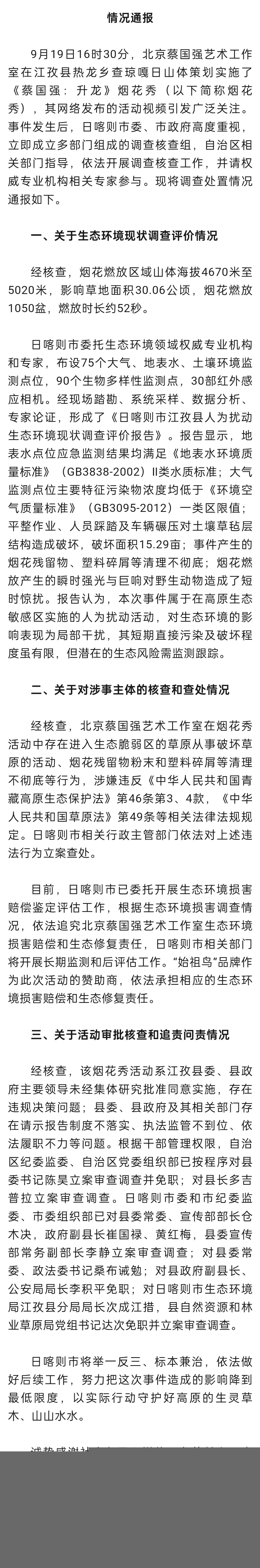 今年9月,户外品牌始祖鸟联手以火药爆破作品成名的艺术家蔡国强,在喜马拉雅山放烟花一事引发争议。随后,始祖鸟、蔡国强先后发文致歉。今日,西藏日喀则市发布《蔡国强:升龙》烟花秀调查处置情况通报,相关行政主管部门依法对北京蔡国强艺术工作室涉嫌违法行为立案查处,赞助商“始祖鸟”依法承担相应的生态环境损害赔偿和生态修复责任。