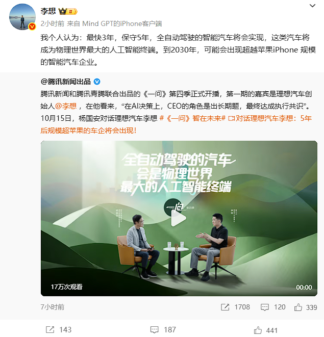 理想汽车CEO李想今日发文表达了自己对于自动驾驶汽车发展的看法。他认为:最快3年,保守5年,全自动驾驶的智能汽车将会实现,这类汽车将成为物理世界最大的人工智能终端,到2030年,可能会出现超越苹果iPhone规模的智能汽车企业。