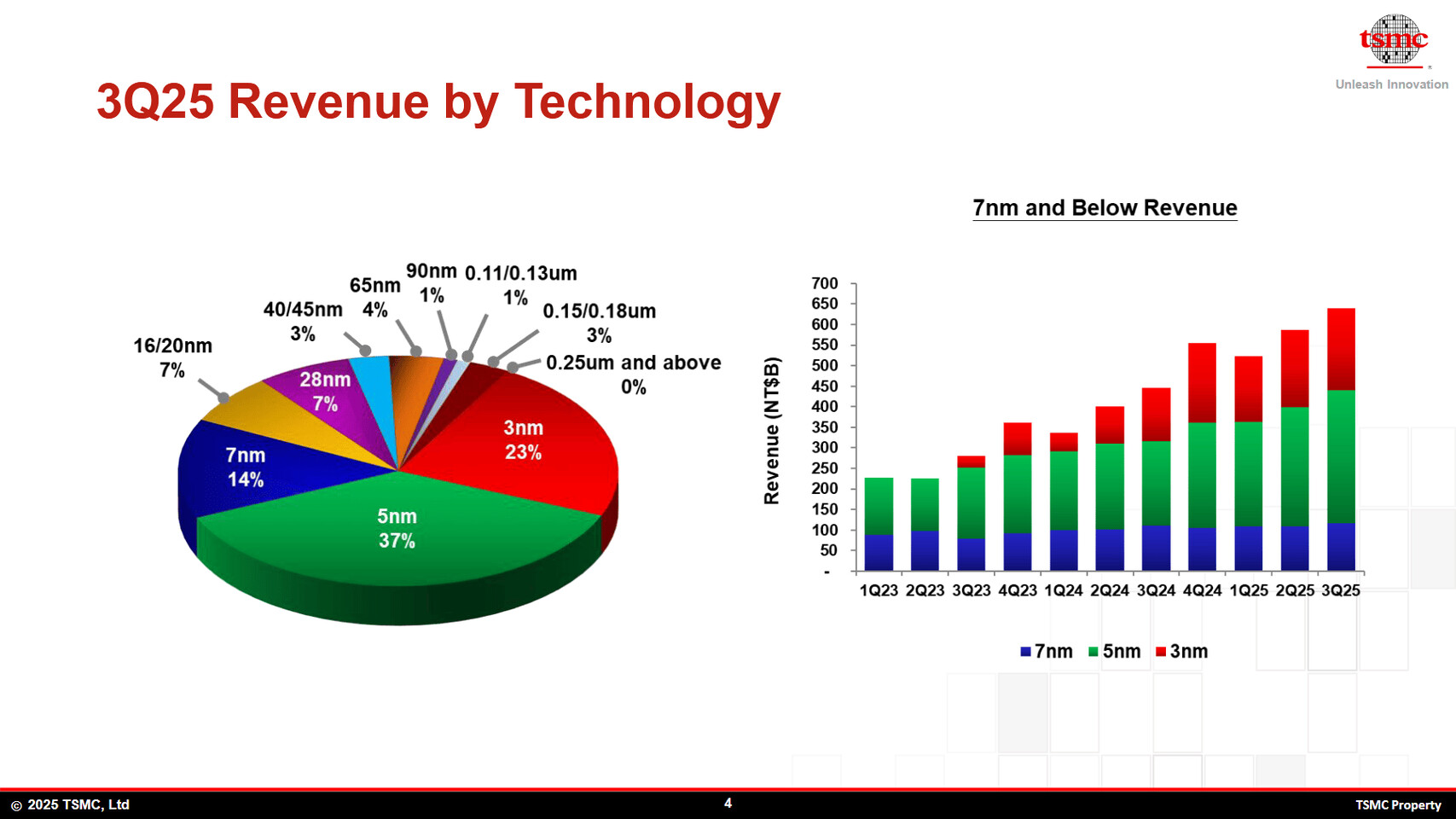 在本季度,台积电共处理了约408.5万片300毫米硅片,同比增加约22.4%。公司报告显示,其同期营收同比增长近41%,本季度销售额达到约331亿美元,利润超过150亿美元。先进制程家族(包括全部N3、N5和N7工艺)如今已占总销售额约74%。其中,N3工艺出货占硅片销售收入的23%,N5为37%,N7为14%。N5家族贡献了最大增幅,反映出AI加速器及其他高端器件的强劲需求。值得注意的是,每一款制程节点的定价策略各异,越新的节点因制造工艺复杂、投入大,价格也显著更高。