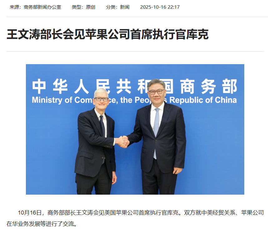 据商务部网站消息,今日,商务部部长王文涛会见苹果公司CEO库克。双方就中美经贸关系、苹果公司在华业务发展等进行了交流。