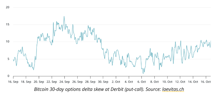 最新的市场动态显示,交易员正为潜在的更多下行风险做准备。据Cointelegraph今日报道,比特币期权市场的一项关键指标“delta skew”已攀升至10%以上,表明专业交易员正以溢价购买看跌期权。这通常被视为市场看空情绪的典型信号。