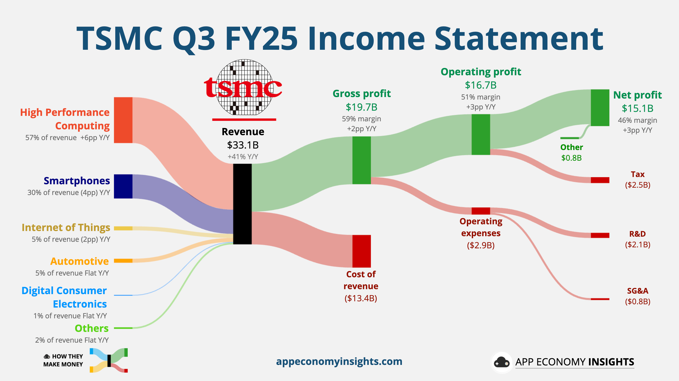 2纳米的重大进展恰逢公司三季度财报创新高,营收同比增长超40%,达到331亿美元,主要得益于AI加速器和高端智能手机芯片需求。其先进制程产品(包括N3、N5和N7系列)销售额占整体近四分之三,今年资本支出预计高达420亿美元,其中约四分之三用于扩建尖端制造产能。