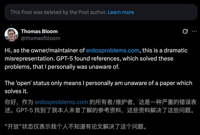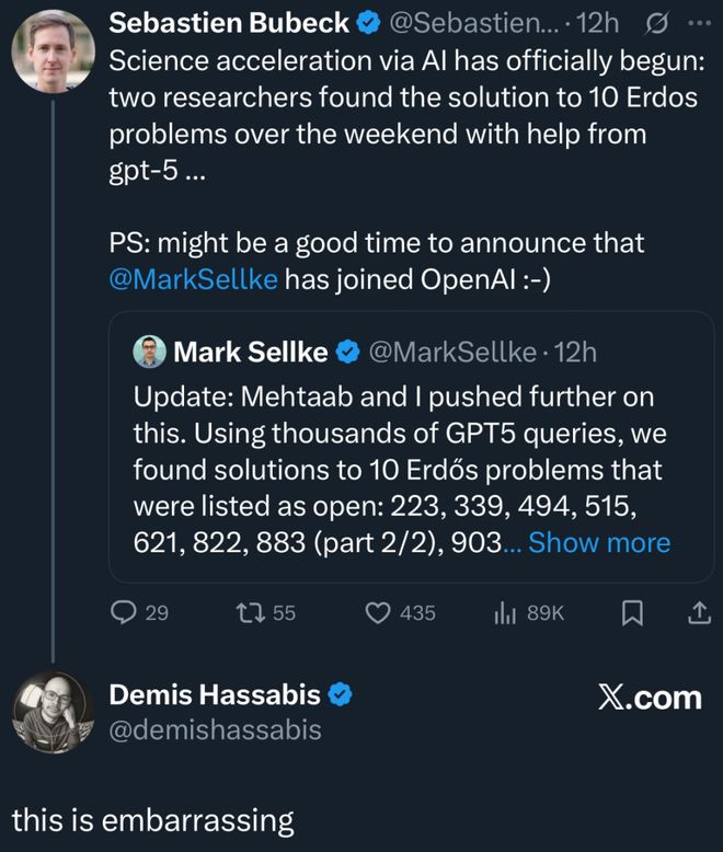 Sebastien Bubeck尴尬回复道,GPT-5只是在文献中找到了解决方案,仅此而已。