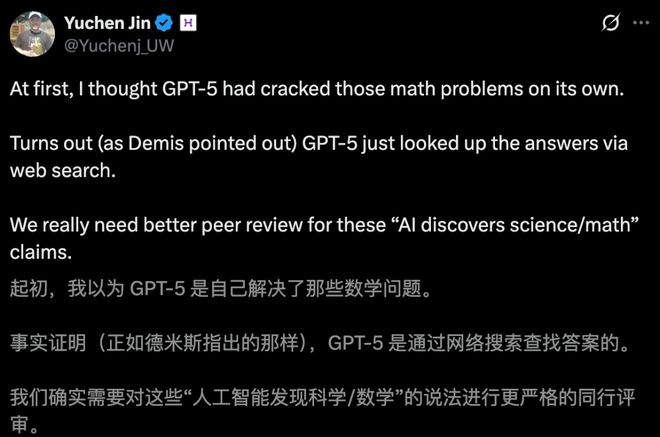 Hyperbolic创始人Yuchen Jin称,「关于AI发现科学/数学的新发现,需要更多的同行评审」。