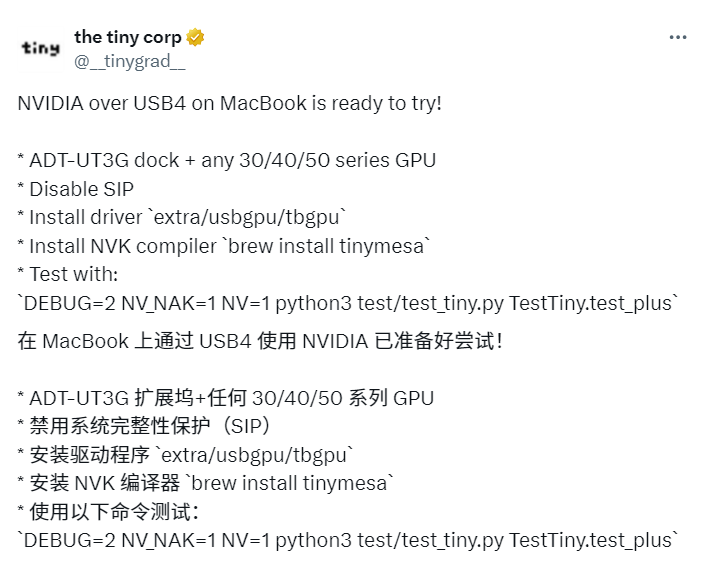 不过对于期待游戏或图形性能的用户来说,可能要失望了,因为这些驱动程序专为AI开发而设计,尚不能提供MacBook上的显示输出功能。