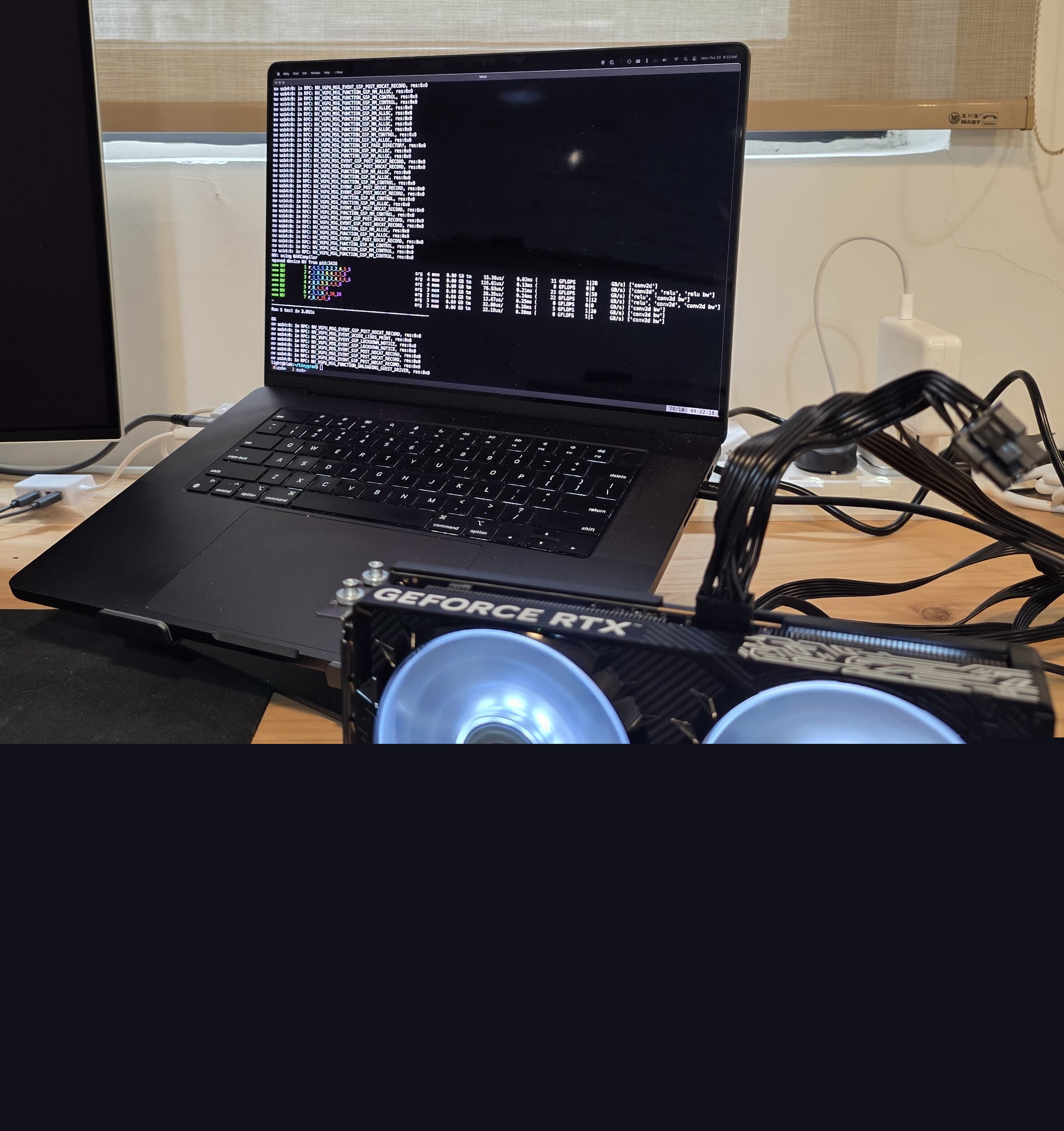 TinyCorp发布了一张图片,显示一台MacBook Pro M3 Max正在运行Tinygrad,并连接了一块RTX GPU,通过USB4连接到ADT-UT3G扩展坞。
