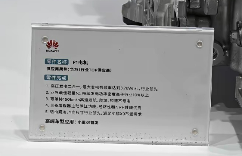 与此同时,小鹏还展示了华为自研的P1电机实物,高压发电二合一,最大发电机效率达到3.7kW/L,行业领先。