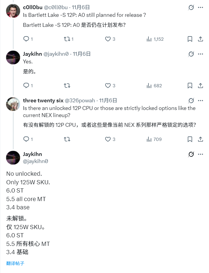 Jaykihn表示,12P核的Bartlett Lake-S旗舰CPU的TDP功耗只有125W,基础频率3.4GHz、单核睿频最高可达6.0GHz、全核睿频5.5GHz,L3缓存为36MB。