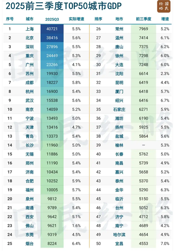 全国前50强的城市排名又变化了,不过上海、北京、深圳依然稳居前三,这些城市成为人工智能、新能源汽车最大受益城市。2025年前三季度GDP数据揭示城市经济新格局:京沪深领跑高新产业,广州企稳回升,宁波、青岛挑战传统强市。