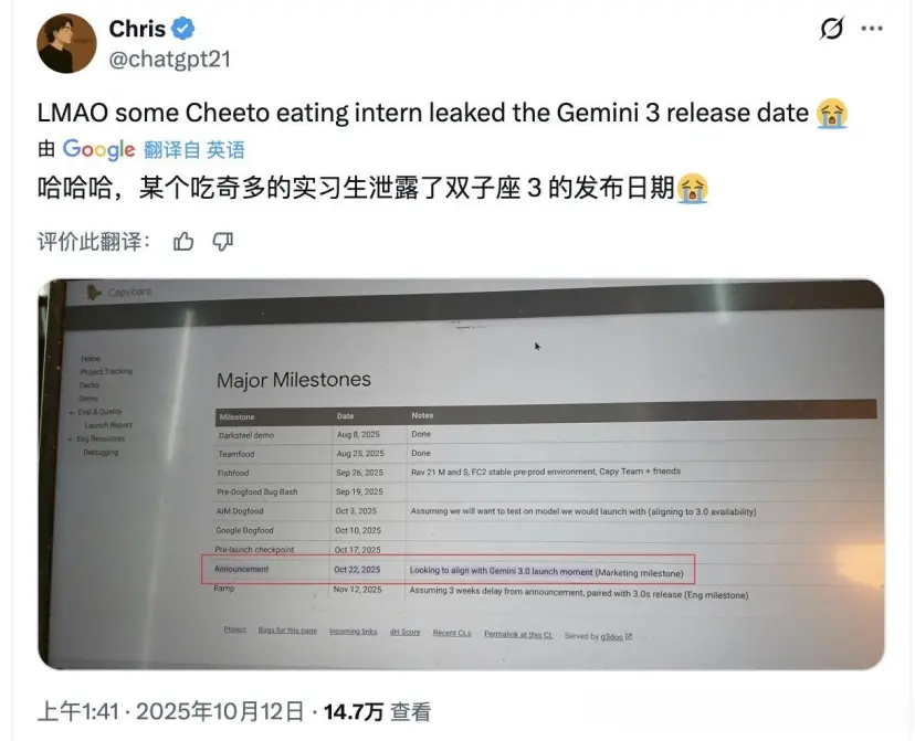 从10月开始,各种“意外泄露”接踵而至。10月23日开始流传一份日历,在其11月12日“Gemini 3 Pro Release”的内部日历截图疯传。