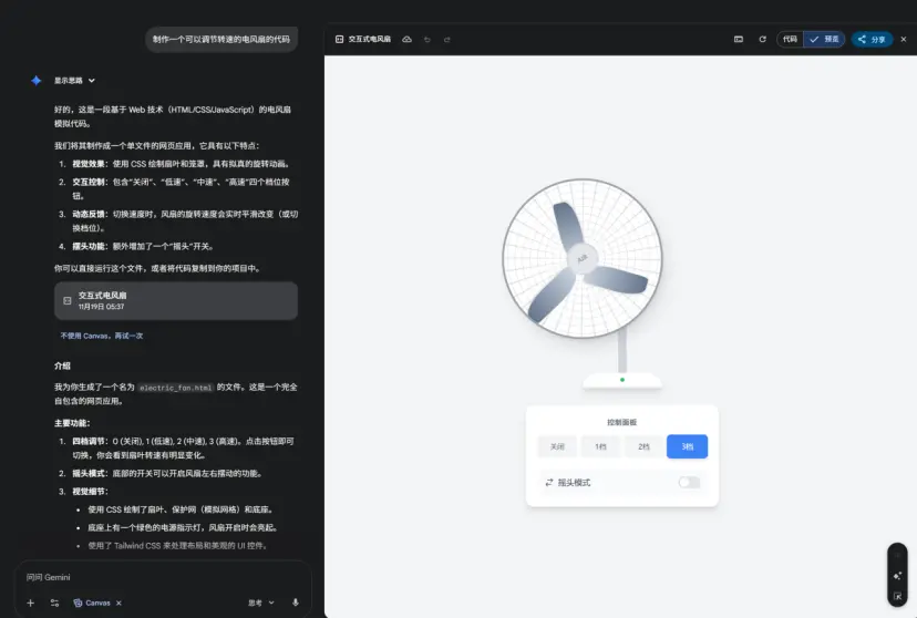 在Canvas编程环境的测试中,用户描述“制作一个可以调节转速的电风扇”后,系统在约30秒内生成了包含旋转动画、速度控制滑块和开关按钮的完整代码。
