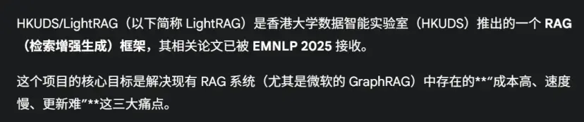 我选的项目是GitHub上最近星数非常高的项目,叫做LightRAG。这是通过整合图结构来增强上下文感知和高效信息检索,从而改进检索增强生成,实现了更高的准确性和更快的响应时间。项目地址https://github.com/HKUDS/LightRAG