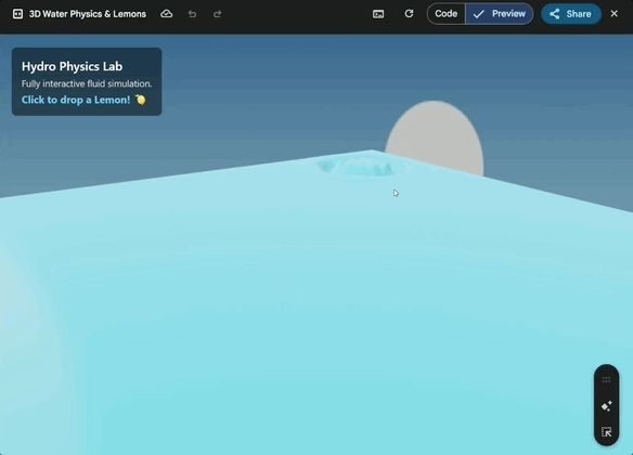 制作一个逼真的水物理测试场景,完全3D可交互,具备动态反射与波浪效果,并可点击任意位置将柠檬投入水中。