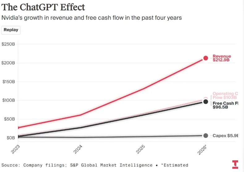 ChatGPT点燃AI浪潮后,NVIDIA的营收与自由现金流在四年内直线上冲,远超资本开支的增幅,形成史无前例的“现金喷泉”