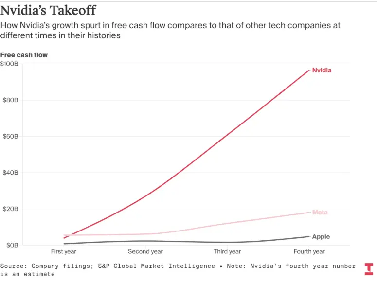 NVIDIA的自由现金流在四年内接近百倍暴涨,远超Meta与Apple在各自巅峰时期的增速
