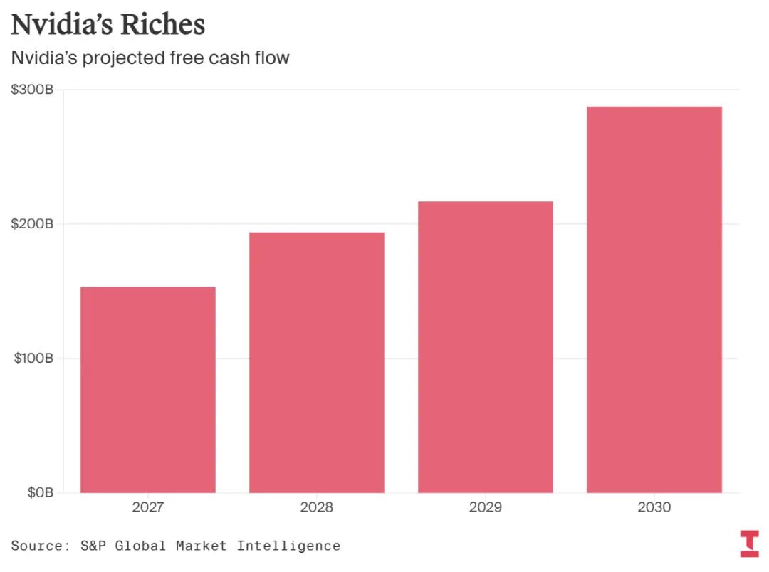 分析师预计NVIDIA在2027—2030年的自由现金流将持续走高,到2030年逼近3000亿美元