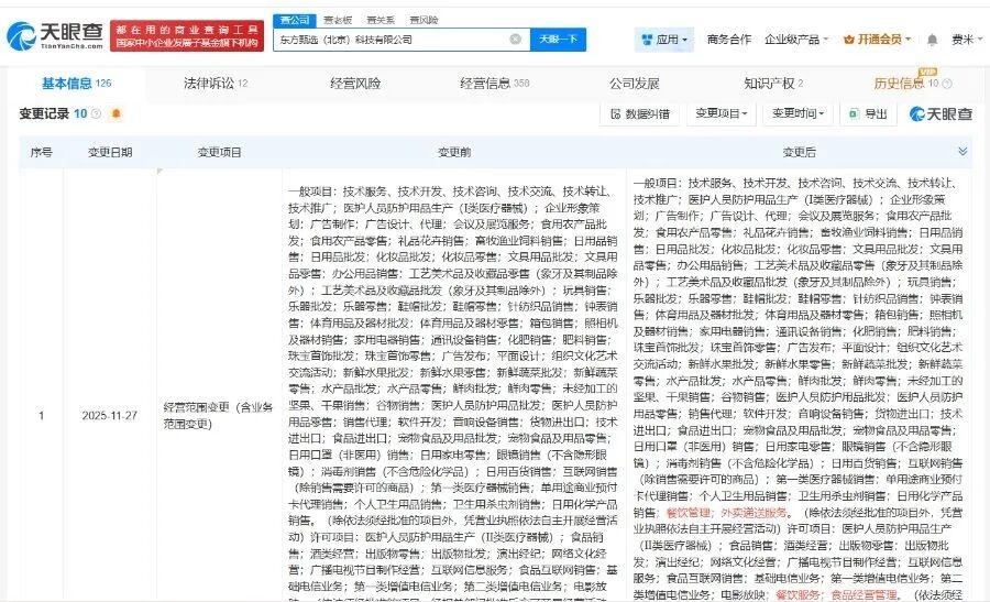 近日,天眼查显示,东方甄选(北京)科技有限公司发生了工商变更。孙东旭卸任法定代表人、执行董事、经理等职务,由俞敏洪接任,并担任董事。值得关注的是,东方甄选公司经营范围新增餐饮管理、外卖递送服务、餐饮服务等。