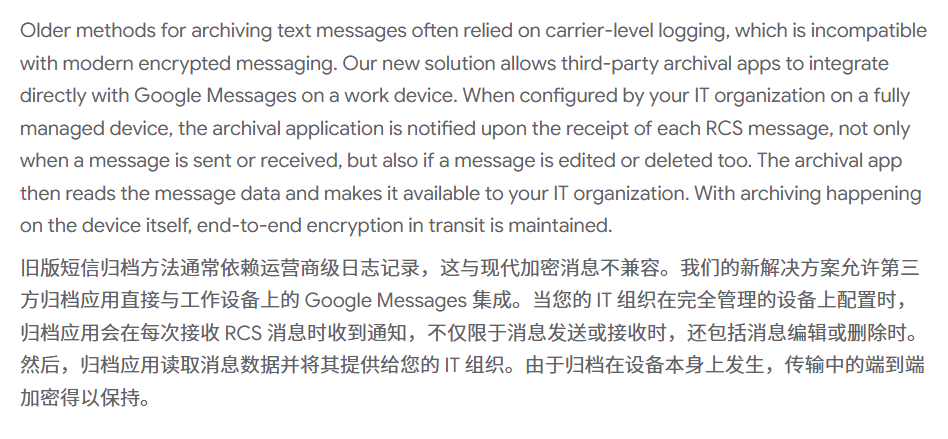 即使RCS消息在传输过程中享受端到端加密的保护,一旦消息存储在被公司控制的设备上,它们就会被解密,从而可被雇主访问和阅读。