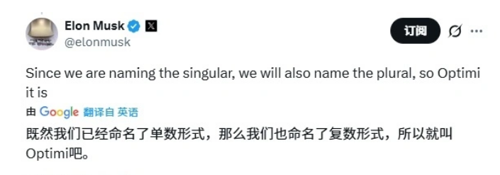 “Optimi”还体现了马斯克对命名权的幽默宣示,将其从英语标准复数“Optimuses”改为拉丁风格的“Optimi”,仿佛在为一个即将征服星系的机器人军团冠名。
