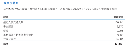 财报数据显示,截至2025年6月底,贝壳员工总人数约为13.18万人,较2024年末的13.5万人减少约3200人。其中,经纪人和支持人员人数约为10.65万人,其他则为平台运营,研发,业务拓展、销售及市场营销,行政及管理等职能人员。