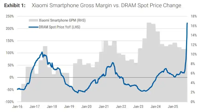 全球存储疯狂涨价,势必会挤压手机厂商的利润,但摩根士丹利在最新报告中却力挺雷军,认为这对小米利润率是有帮助的。摩根士丹利在最新发布研报中指出,上游存储芯片成本的飙升,通过特定的转嫁机制,反而可能成为终端厂商利润率改善的契机。