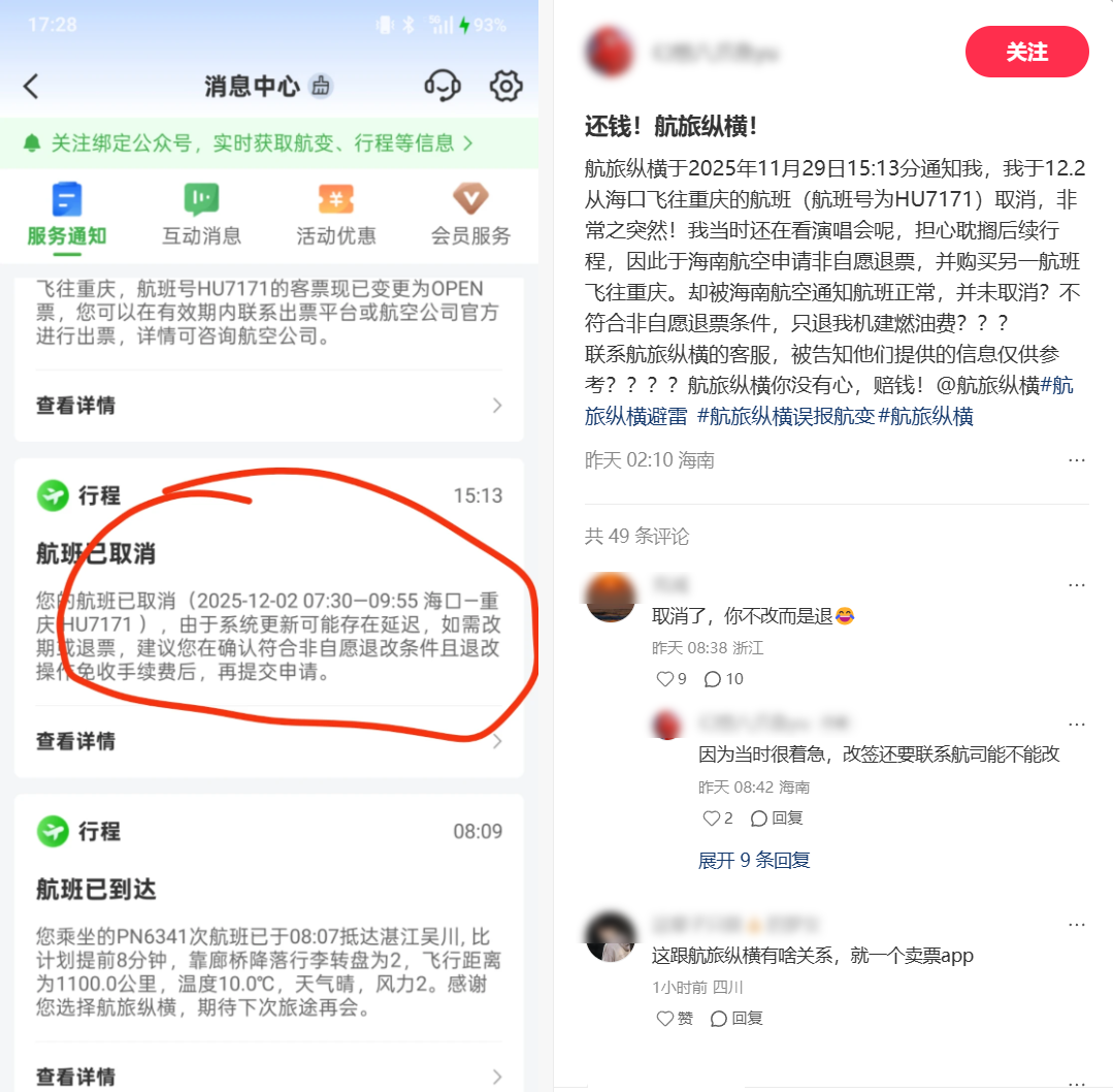 还有网友称,自己原计划搭乘12月2日,从海口飞往重庆的海航航班(HU7171),收到航班取消信息后,向海南航空申请非自愿退票,并购买了另一航班飞往重庆的航班。